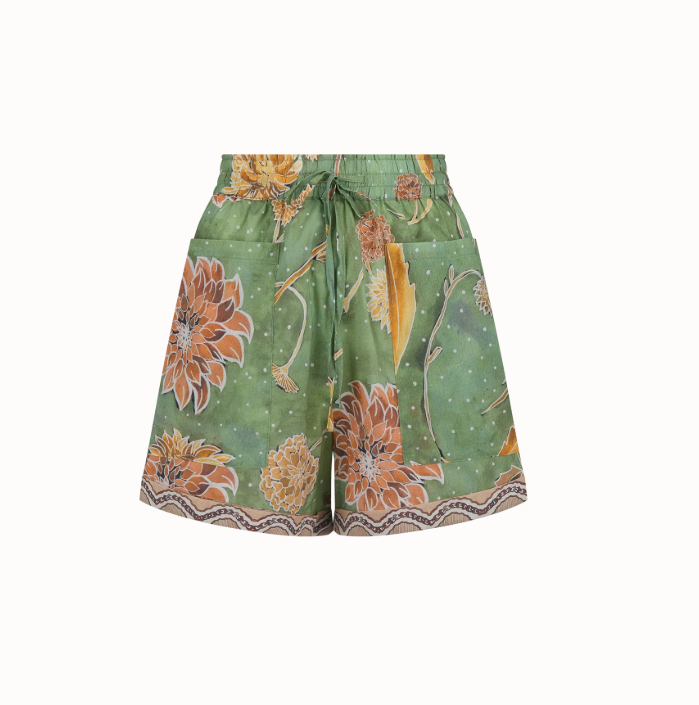 The Dahlia Shorts feature soft, hand-painted dahlias set against a leafy green base inspired by the romance of English gardens. Lightweight, organic cotton designed for warm days with a relaxed fit.