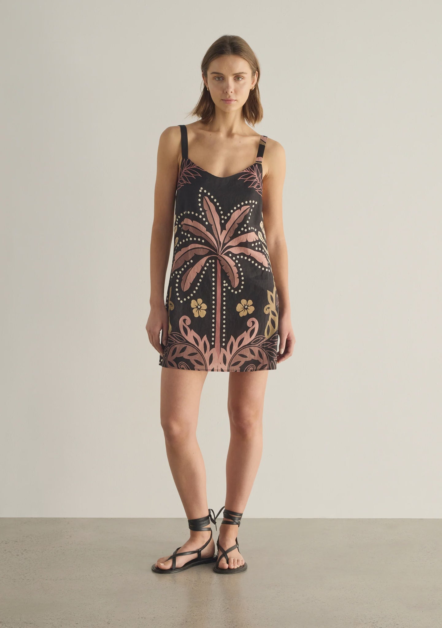 The Marina Mini Dress in an earthy Calypso print features a flattering shift silhouette with a round neckline and softly grounded palm placement. Crafted from a breathable linen blend, it’s an effortless warm-weather staple designed for relaxed, everyday summer style.